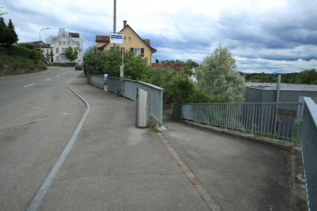 "Der Weg begann im Risiwald. Er führte am Bauernhof Faver und nach etwa 100 Meter am Häuschen der Familie Müller-Faver vorbei (Eltern von Lehrer Otto Müller). Weiter schlängelte sich der Weg an den Wiesen und Äckern Favers entlang zum Bauernhof meiner Grosseltern. Vorbei am Schopf, voll mit Werkzeug, Mostpresse, Sägemaschine, Spaltstock etc., hinunter zum Stall. Vor dem Wohnhaus begann eine unübersichtliche Kurve. Dann führte der Weg aufwärts, vorbei an unserem Garten auf der rechten Seite und links an der abfälligen Wiese Meinrad Schneiders und mündete in die Stetterstrasse."