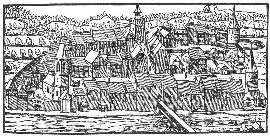 städtische Metzgerei. An deren Stelle stehen seit ca. 1900 die beiden Häuser Grosse Kirchgasse 10 und 12. Die Hitze in der südlichen Altstadt war derart gross, dass zwar die steinerne Kirche mehrheitlich stehen blieb, die Ziegel auf deren Dach aber barsten. Die 1505 gefällten Stämme dürften daher im kommenden oder übernächsten Jahr beim vollständigen Wiederaufbau des Badhauses verwendet worden sein. Der ganze ursprüngliche, später aber durch weitere Balken verstärkte Dachstuhl besteht aus 500-jährigen Hölzern. Somit kann geschlossen werden: Grundriss, Baukubus und Dach haben seit einem halben Jahrtausend ihre Form nicht verändert, während im Innern im Laufe der Jahrhunderte viel „gebastelt“ wurde. Diese ursprüngliche Gestalt ist auch aus dem Holzschnitt in der Chronik von Johannes Stumpf vom Jahre 1548 ersichtlich, wo dieses Gebäude – quer zur übrigen Häuserzeile gestellt -erstaunlich wirklichkeitsgetreu wiedergeben ist.