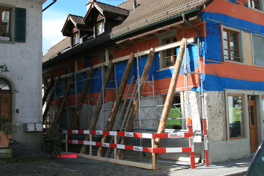 Bekanntlich mussten im März dieses Jahres (2008)die Bewohner das genannte Haus aus Sicherheitsgründen vollständig räumen, da schon längere Zeit und nicht zuletzt in den 80-erjahren des letzten Jahrhunderts bei Umbauarbeiten tragende Holzelemente teilweise zersägt wurden und somit die Statik nicht mehr gewährleistet war. Da sich die Balken bis zu 30 cm durchbogen, bestand akute Einsturzgefahr, sodass das Gebäude äusserlich mit dicken Baumstämmen auf der Traufseite gesichert und im Innern mit Balken und Eisenstangen abgestützt werden musste. Glücklicherweise hat sich die Axa Winterthur als Besitzerin dieses Hauses trotzdem entschlossen, das Haus nicht abzureissen, sondern stilgerecht zu renovieren.