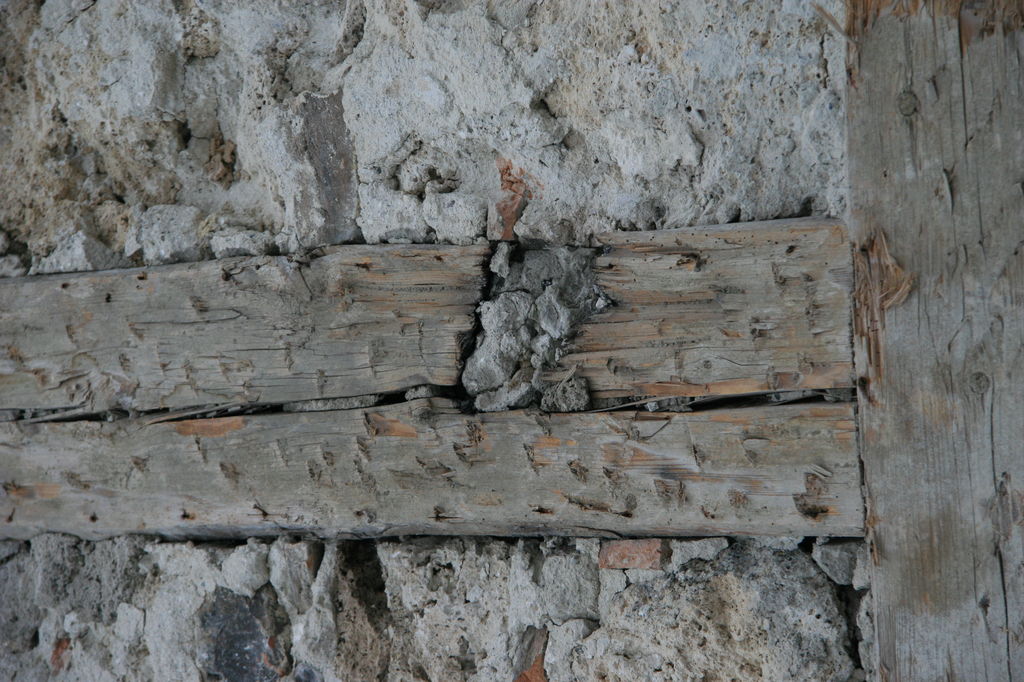 Rauchgeschwärzte Balken und eine rauchgeschwärzte Mauer