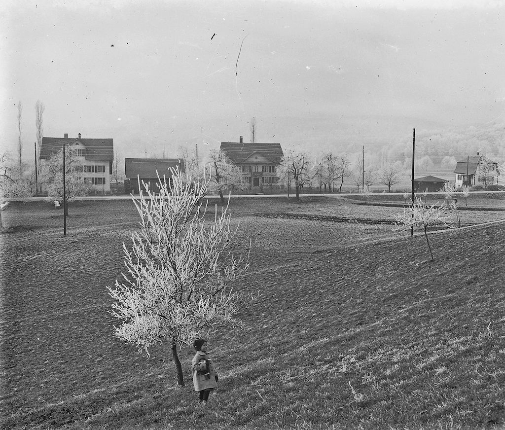 Links das Gebäude der Familien Strebel und Hassler. In diesem Haus betrieb laut Robert Höhener 1921 Frau Harzenmoser-Frey im Dachgeschossein Modegeschäft.