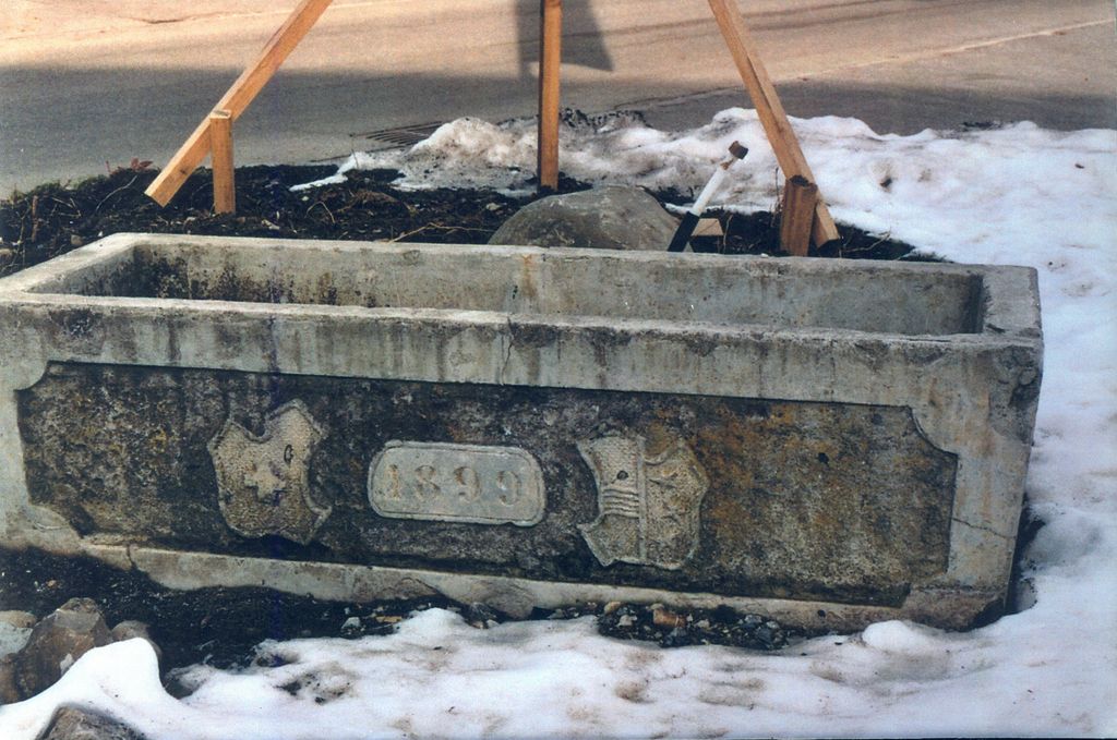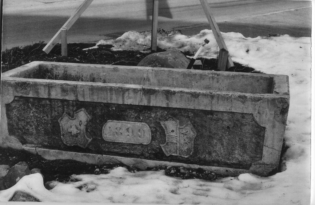 "Vor der total erneuerten Liegenschaft Zeier am Grumetweg in Mellingen ist ein alter Brunnentrog zu bewundern, der vor der Umgestaltung des Geländes fast nicht mehr sichtbar war. Dieser Trog ist insofern von besonderem Interesse, da an der Seitenwand die Jahrzahl 1899 zwischen einem Aargauer- und einem Schweizerwappen zu sehen ist. Diese Wappen liefern den Hinweis, dass es sich um einen 'offiziellen' Brunnen handeln muss.