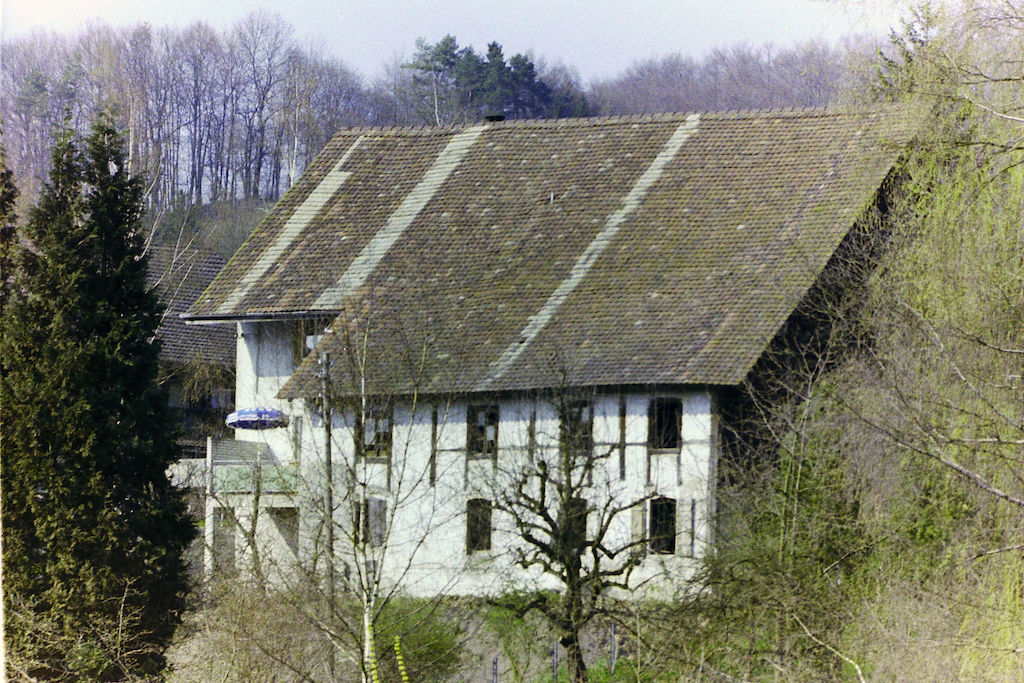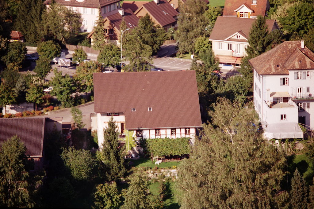 Die Liegenschaft Zeier vor dem Umbau. Dieser erfolgte 2003, wobei das Mauerwerk des Wohnteils erhalten blieb und der Rest der Liegenschaft neu aufgebaut wurde, über den Umbau s. Bild-Nr. 02061.8. Wir sehen hier das Gebäude am Grumetweg 1/3 von der Reussseite her. Wie wir sehen, bestand der Ökonomieteil teils aus Riegelmauerwerk.