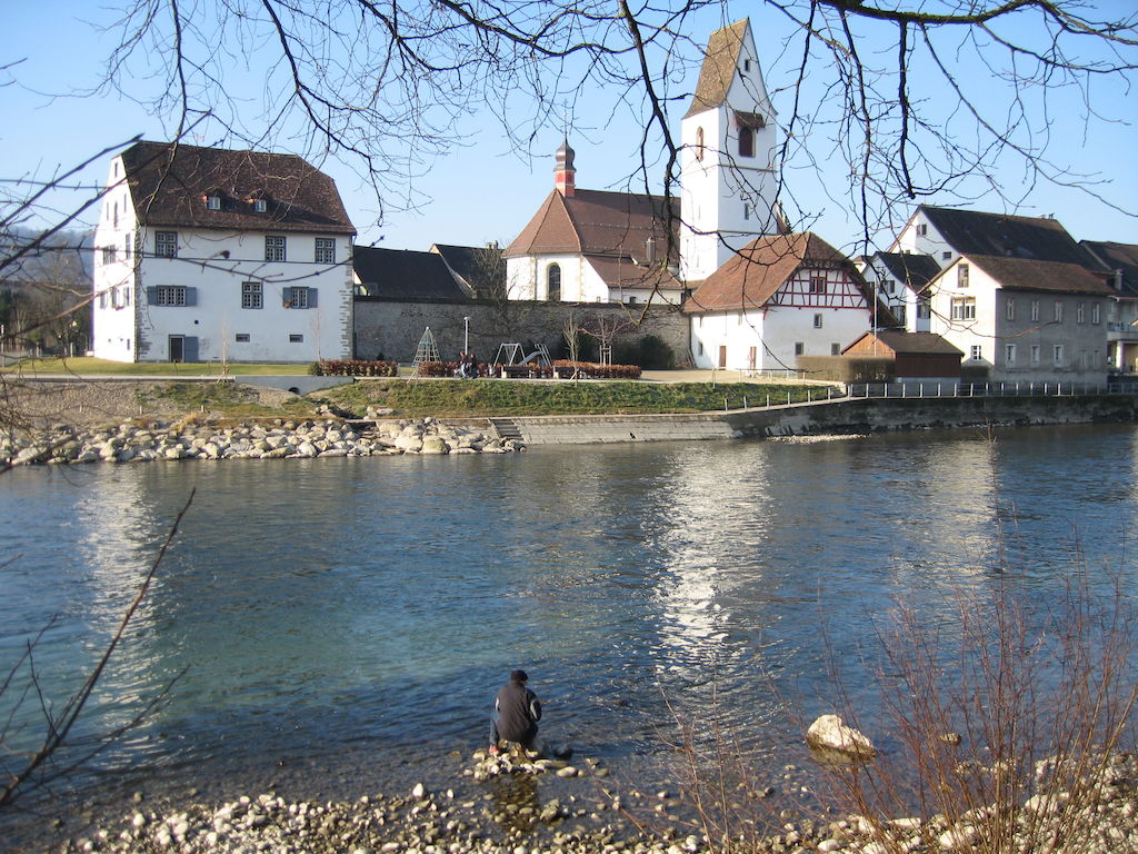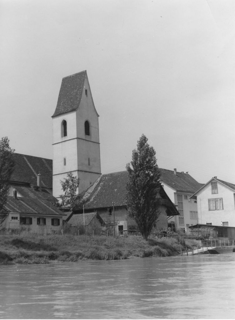 Zwischen Kirchturm und Reuss die Spittelscheune. Rechts der Spittelscheune das Haus Reussweg 1. Dahinter das Pfarrhaus und Rathaus.