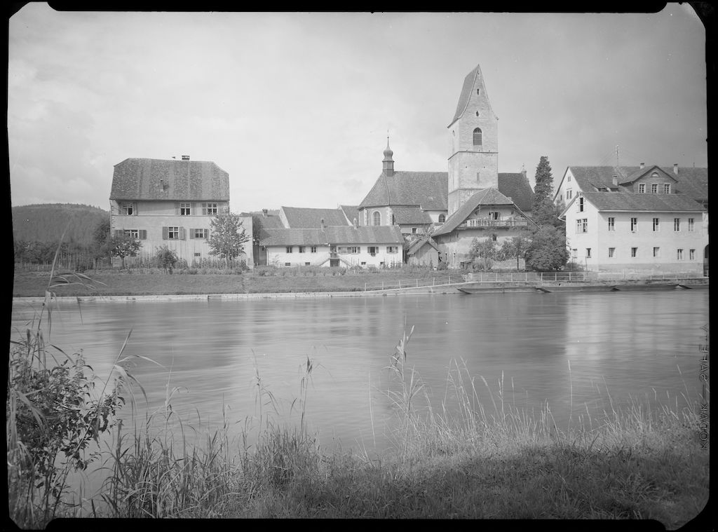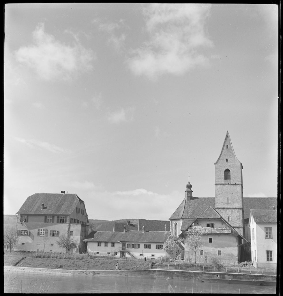 Zur Datierung: Noch steht neben dem Rathaus am Kirchplatz das alte Pfarrhaus, das 1956 abgerissen und durch einen Neubau mit wesentlich kleineren Ausmassen ersetzt wurde.