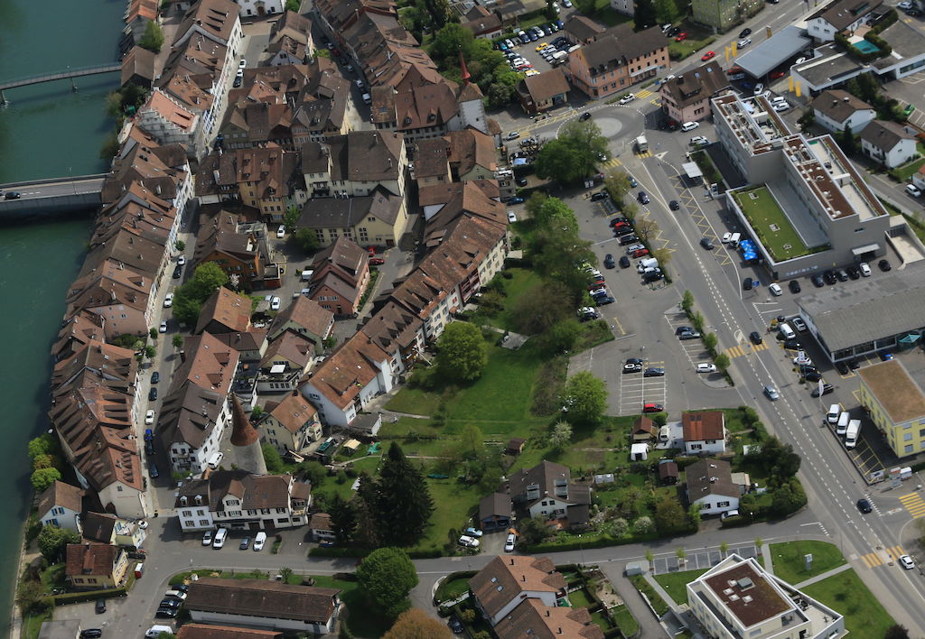 Die Altstadt hebt sich mit dem aufgefüllten Stadtgraben vom Parkplatz sowie von der Birrfeldstrasse und dem grossen Neubau Nr. 3 und 5 ab. Besonders augenfällig ist dies bei den Dächern. Hier viele Ziegel und eine grosse Menge an Lukarnen, dort die vier Attikawohnungen mit Flachdach und begrünter Terrasse. (Dort war einst ein Spielplatz für eine Kinderkrippe geplant.)