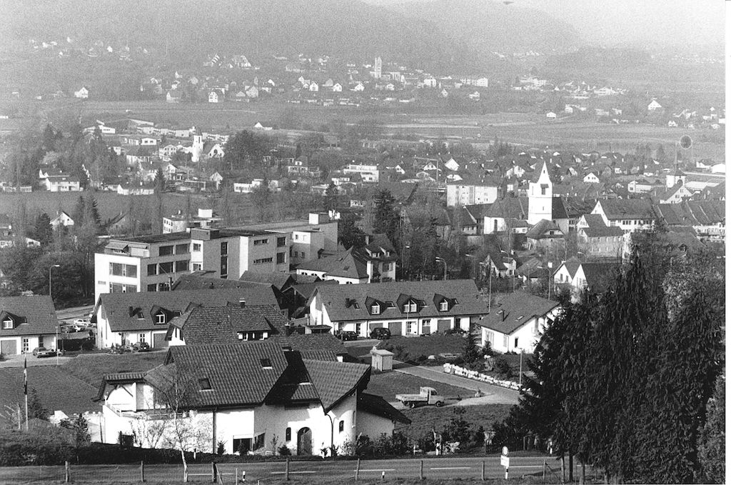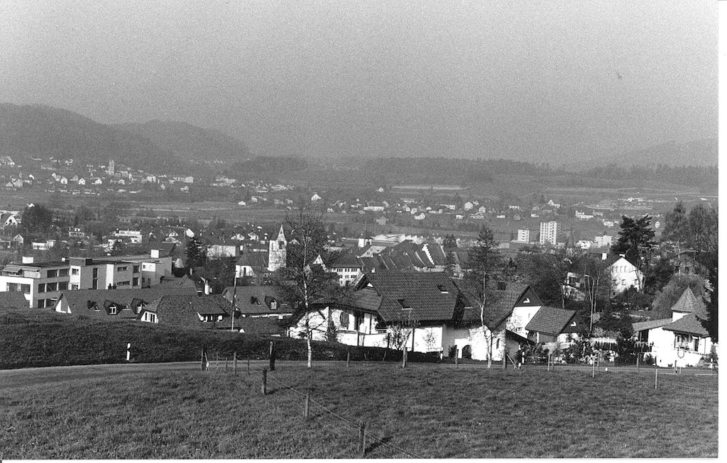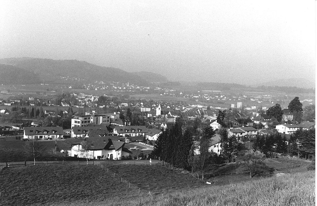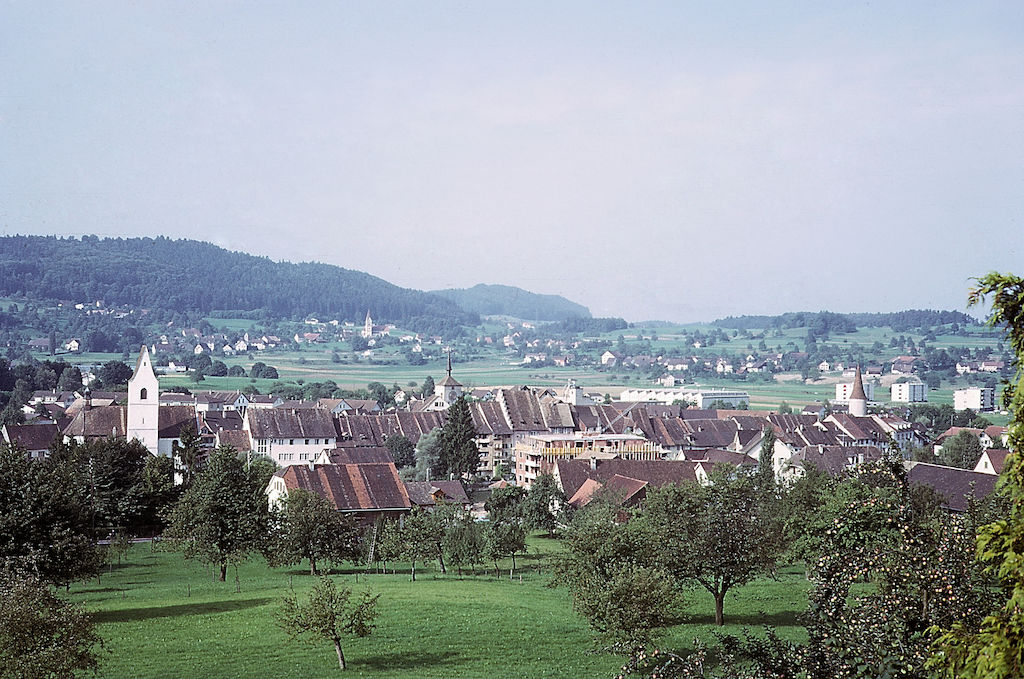 Blick von der Liegenschaft Jean Frey am Sonnenweg aufs Städtchen, vermutlich Herbst 1967.