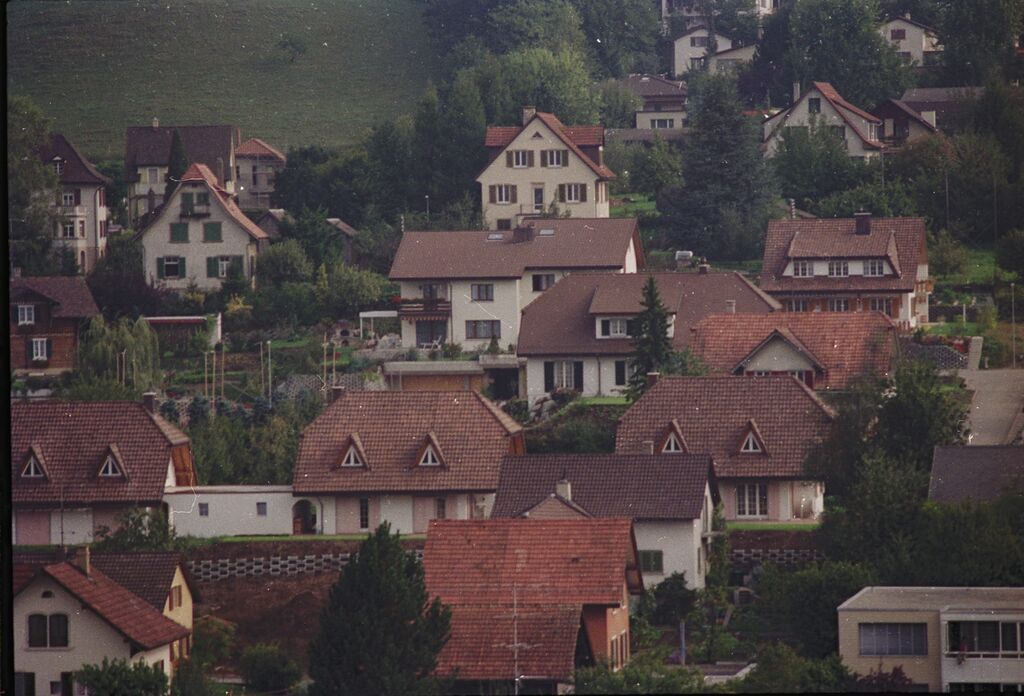 Blick von seiner Liegenschaft am Sonnenweg aufs Städtchen, Herbst 1966: Datierung aufgrund von Nr. 1, wobei die Bäume auf Nr. 1 bereits blühen, auf Nr. 3 aber noch Obst tragen. Der Neubau anstelle der Villa Rohr am Zentralplatz ist noch im Rohbau. Foto Jean Frey.