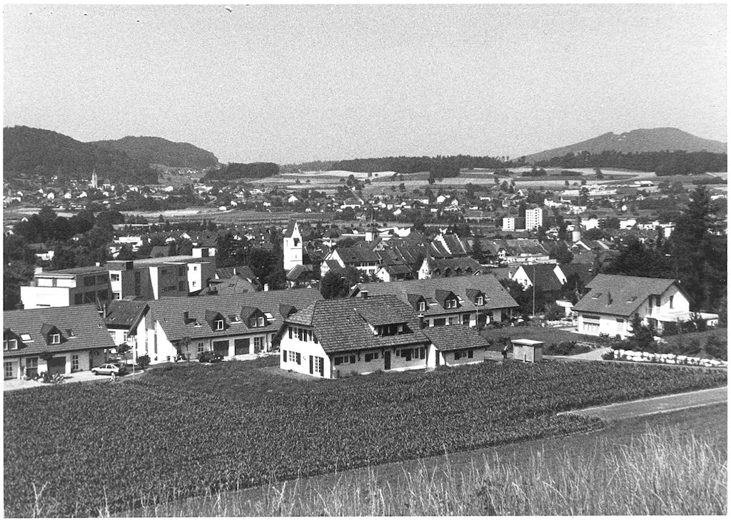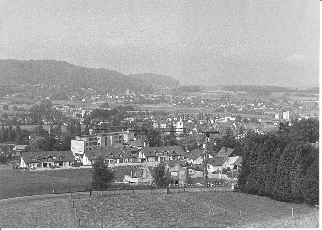 Blick von der Liegenschaft Jean Frey am Sonnenweg aufs Städtchen, möglicherweise Winter 1967/68. Im Hintergrund Wohlenschwil-Büblikon.