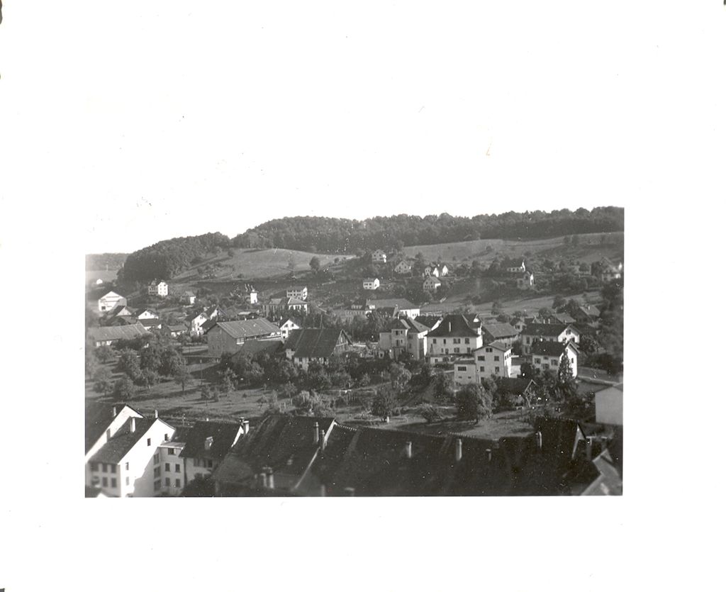 Blick von der Liegenschaft Frey am Sonnenweg aufs Städtchen, vor 1960. Der Glockenturm der Stadtkirche ist noch nicht renoviert.