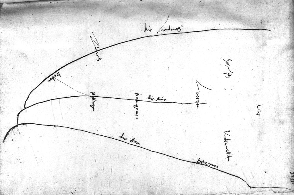 Diese strategische Skizze zeichnete Zwingli eigenhändig, als zwischen den beiden Kappeler Kriegen 1529 und 1531 die Lage einmal mehr kritisch war und man die katholischen Orte durch eine Proviantsperre in die Knie zwingen wollte. Sie zeigt die Flüsse Limmat, Reuss und Aare mit den Städten Zürich, Baden, Mellingen, Bremgarten, Luzern und Bern. Im oberen Teil der Skizze sind noch Schwyz, Uri und Unterwalden eingezeichnet.