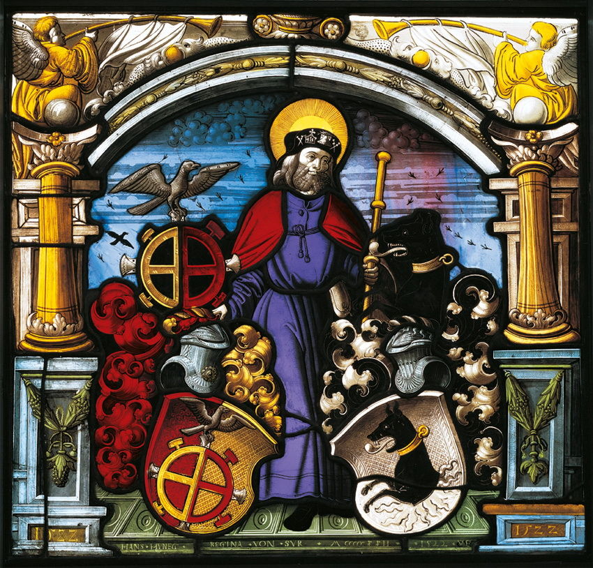 Glasgemälde, gestiftet von Hptm. Hans Hünegg, von Mellingen, und seiner Gattin Regina von Sur. Geschaffen wurde diese Scheibe von Conrad Wirz, von Erlenbach/ZH. Hans Dachselhofer, aber meist aufgrund seines Wohnsitzes, dem Schlösschen Hünegg (heute Restaurant „Chang-Cheng“), Hans Hünegg genannt, betrieb an seinem Domizil Söldnerwerbungen. Dieser trat kurz nach der Schlacht von Marignano 1515 als Sölderhauptmann in Erscheinung. So warb Hünegg 1521 und 1525 Soldaten für den Papst. Oft marschierte er mit den Soldaten in den Süden. Er leistete auch in Neapel Dienst, wo er vor 1530 starb.