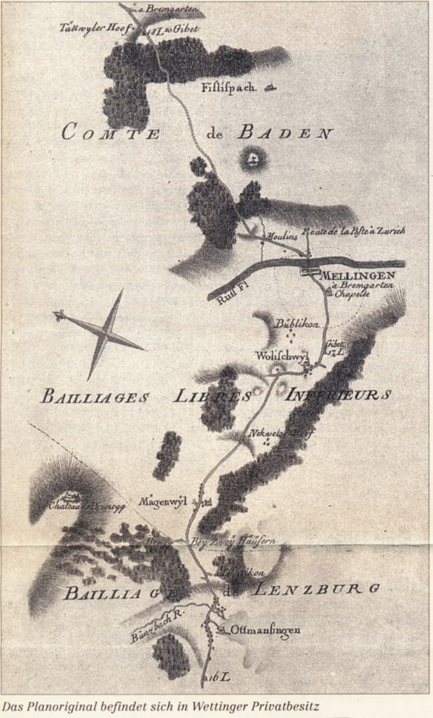 Auf dem Blatt 9, welches den Strassenverlauf zwischen Othmarsingen und Dättwil festhält, sind mit den Bezeichnungen „16 L“, „17 L“ und„18 L“ drei sogenannte Stundensteine eingetragen. Jener mit der 16 ist heute noch zu sehen; er steht von Othmarsingen in Richtung Lenzburg kurz nach der grossen Bahnunterführung beim AMP. Jener mit der 17 müsste ungefähr beim steinernen Kreuz ausgangs Wohlenschwil in der Nähe der 'Liegenschaft Blank' stehen, der mit der 18 in der Nähe des Dättwiler Restaurants 'Pinte', nachdem die Strasse den leichten Anstieg nach dem 'Hüehnerstäg' überwunden hatte. Weitere wichtige Details zeigen die Mägenwiler Kapelle, das Dorf Eckwil, damals als 'Nekweler Hoof' eingetragen, den Mellinger Galgen (als 'Gibet' in französischer Sprache), die St. Antonius-Kapelle und die beiden Mühlen im ,Mellinger Dorf' am Mühlebach. Wichtig ist auch, dass nach der Reussbrücke in Mellingen die 'Route de Ia Poste à Zurich' [d.h. für die Postboten zu Fuss und zu Pferd über den Heitersberg] abzweigte, also über den Heitersberg nach Spreitenbach führt, wo die Einzweigung der wichtigen Route als 'Route de Ia Poste à Mellingen' eingezeichnet ist. Ein weiteres interessantes Detail: Die Strasse von Mellingen nach Baden führte nicht über Fislisbach, sondern durchs heutige Mellinger Bahnhofquartier (Obere Bahnhofstrasse) am 'Reservoir' vorbei und beim heutigen Restaurant 'Sommerhalde' - vielen als 'Hüehnerstäg' bekannt - vorbei nach Dättwil. Von diesem Strassenstück aus sah man wie heute noch hinüber zum 'Fislisbacher -Boll', wo schon zu jener Zeit zuoberst ein Kreuz stand." Die heutige Strasse von Mellingen nach Fislisbach wurde erst um 1870 gebaut.