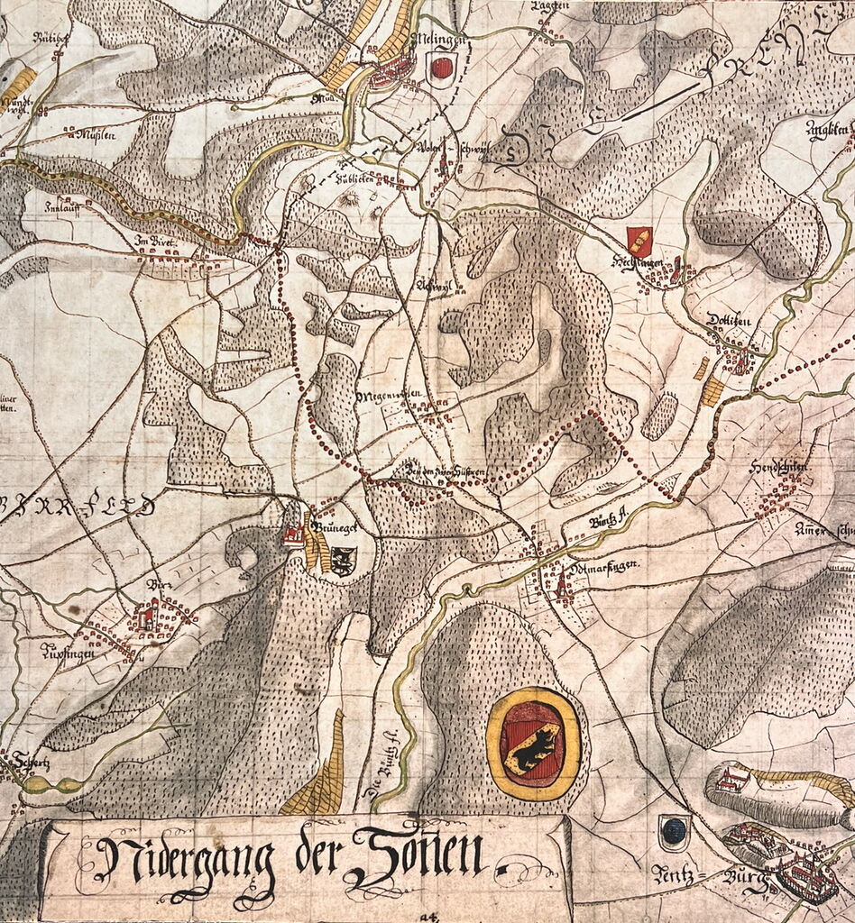 Ältester Plan von Mellingen-Dorf nordwestlich der heutigen Trottenstrasse. Dieser Plan lag wohl ursprünglich im Archiv der Grafschaft Baden in Baden. Heute wird er im Aargauer Staatsarchiv aufbewahrt.