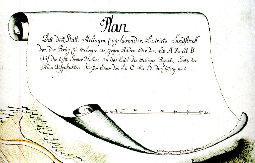 Dess der Statt Melingen Zugehörenden Districts Landstrass Von der Brugg Zu Melingen an, gegen Baden oder von Lit A Bis Lit B