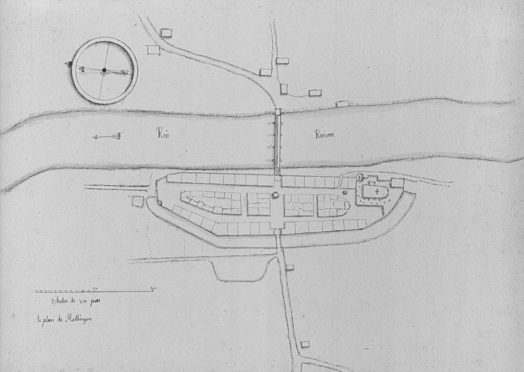 Plan von Mellingen möglicherweise aus der Zeit vor 1811. Begründung dieses Datums: Um die Kirche sind noch Gräber eingezeichnet. 1811 wurde aber der Friedhof bei der Kirche endgültig aufgehoben. Möglicherweise aber standen einzelne Grabsteine auch noch nach 1811 bei der Kirche. Auf jeden Fall handelt es sich um den ältesten, wenn auch nicht sehr genauen Plan von Mellingen. Wie es scheint, ist das 1835 abgebrochene Bruggertor noch eingezeichnet. Da der Plan französisch beschriftet ist, könnte dieser auch aus der Zeit der Helvetik (1798-1803) stammen, als sich mehrmals französische Truppen in und um Mellingen aufhielten.
