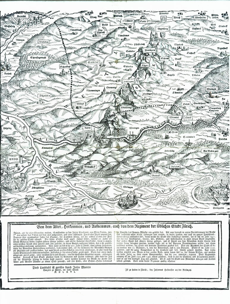 "Carte général de la Comté de Bade et des Provinces Libres, dedié a Monsieur Willading, Chevalier de l`Ordre de St. Marc, apresent Seigneur Baillif Reignant a Bade. Par son très humble obéissant serviteur I.A. Riediger Ingenieur. 1733"