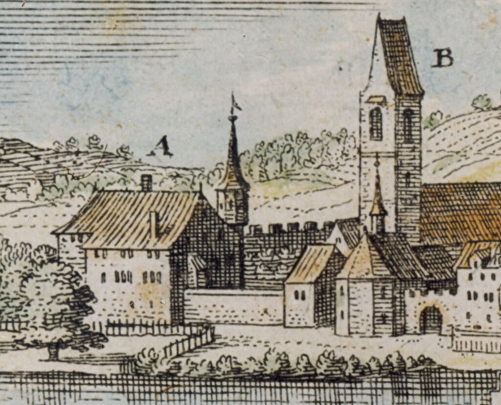 Es handelt sich eindeutig um eine Abbildung, bei welcher der Merian-Stich als Vorlage diente. Die Zeichnung wurde zwischen 1770 und 1790 von Jakob Kuhn geschaffen.