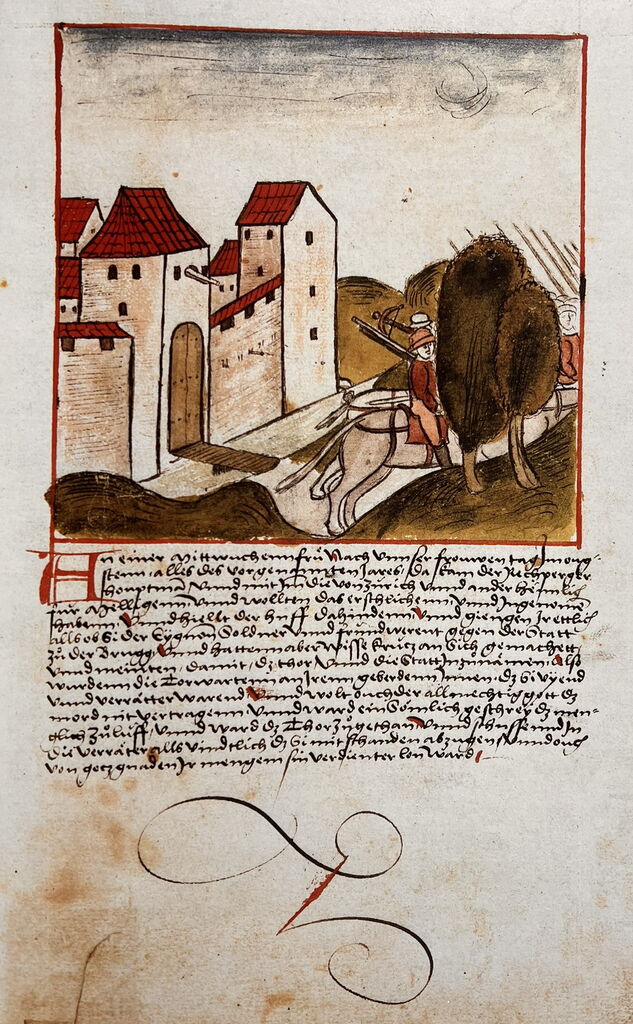 MehrÜber dem Bild steht der folgende Text: „Das die von Zurich fur Mellingen zugent …." Es folgt der hier nicht mehr wiedergegebene, auf der nächstfolgenden Seite stehende Text: "Uff die selben Zitt [1415] warent die von Zurich us gezogen am nechsten dornstag nach mitten abrellen fur Mellingen und lagent da dryg tage da ergabent si sich [am 21. April 1415] an die von Zurich nach sage der brieffen darumb gemacht.“