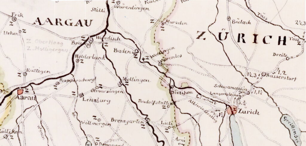 Nachstehend soll diese Karte vor allem aus der Perspektive von Mellingen gesehen werden, das ungefähr in der Mitte dieses Kartenausschnittes zu sehen ist. Alle Ortschaften, die eine Zollstelle hatten, sind darauf mit einem "Z" bezeichnet. Deutlich ist auf dieser Karte die damalige Hauptstrasse zwischen Bern und Zürich, welche bis ins 20. Jahrhundert über Mellingen führte, eingezeichnet. Wir sehen hier Zollstellen in Kölliken, Lenzburg, Mellingen und Baden. Als 1848 der Bundesstaat errichtet wurde, hob man diese Zollstellen innerhalb der Schweiz auf. Da aber diese Zollstellen für die einzelnen Orte eine wichtige Einnahmequelle bildeten, musste der Bund für die Aufhebung dieser Zölle eine hohe Ablösungssumme bezahlen. In Mellingen wurde seit dem Mittelalter der Zoll für den Unterhalt der Brücke verwendet. So erhielt Mellingen seit 1848 aus einem Fonds regelmässig eine gewisse Summe Geld als Ersatz für die entgangene Zolleinnahmen. Dieser Fonds wurde dann aufgelöst, indem man an die 1927/28 erbaute heutige Eisenbrücke einen namhaften Beitrag leistete.