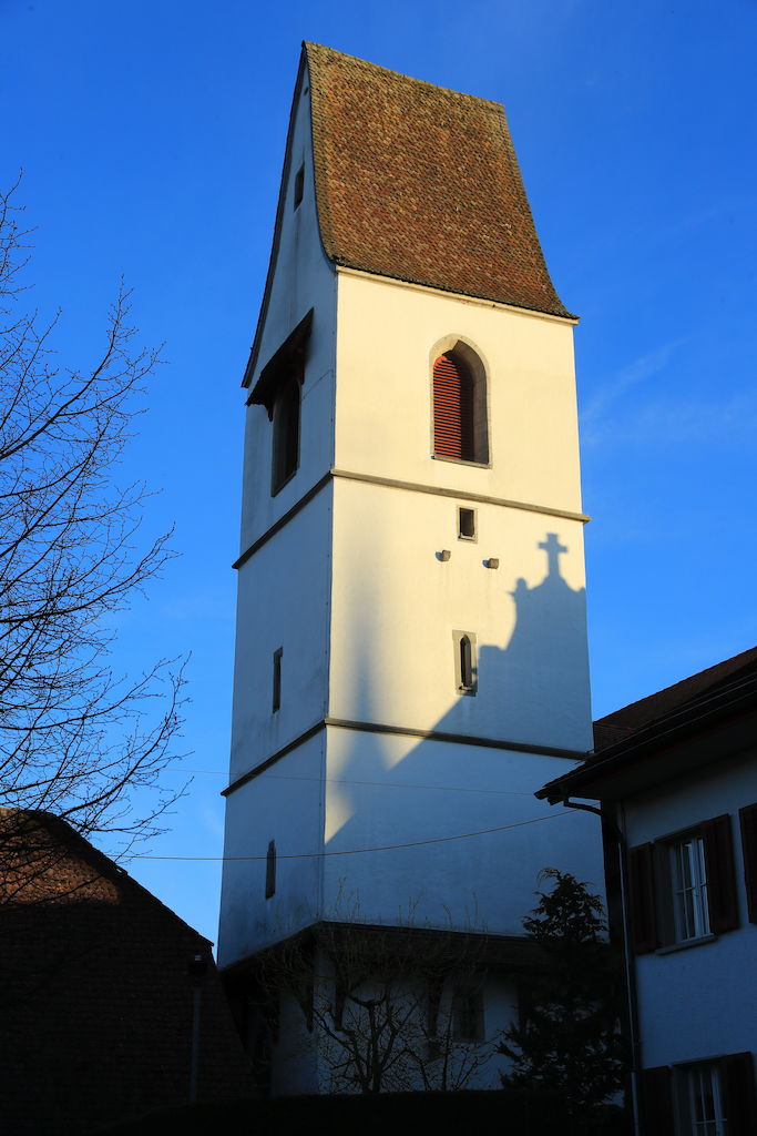 Diese Jahrzahl ist die älteste, welche an einem Gebäude in der Gemeinde angebracht ist. Sie ist unterhalb des Dachs Richtung Grosse Kirchgasse eingemeisselt. Da sie in grosser Höhe angebracht ist, ist sie nur mittels eines Feldstechers deutlich zu sehen. Tatächlich ist urkundlich bezeugt, dass in den 1520er-Jahren am Glockenturm Bauarbeiten vorgenommen wurden. 1538/39 ist erstmals auch eine Uhr am Kirchturm nachgewiesen.