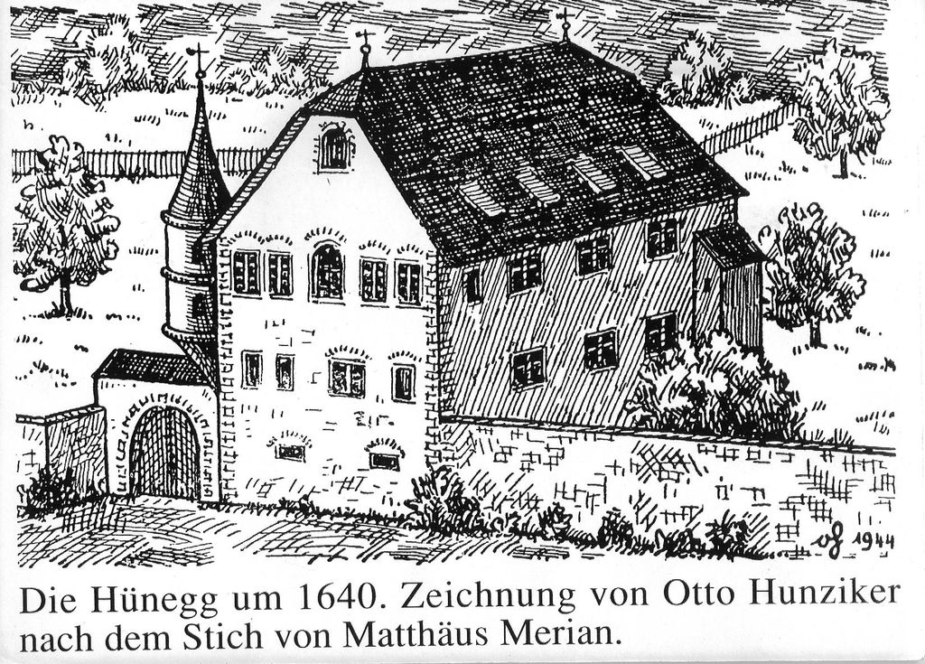 Über das Aussehen des Schlösschens 'Hünegg' um 1640 gibt ein Kupferstich (...) von Matthäus Merian Auskunft: Der über einem hohen Kellersockel errichtete giebelständige Mauerbau trägt darauf ein knappes, abgewalmtes Satteldach. Er besitzt an der Südostseite ein Erkertürmchen mit Spitzhelm und an der Nordwestecke einen zweigeschossigen Latrinenanbau. An der strassenseitigen Stirnfront befindet sich im Giebel eine auffallend grosse, ehemals rundbogige Aufzugsöffnung, die nebst weiteren unregelmässig verteilten Öffnungen verschiedenen Formats bis zum durchgreifenden Umbau in den 20er Jahren des 20. Jh. bestehen blieb (...)