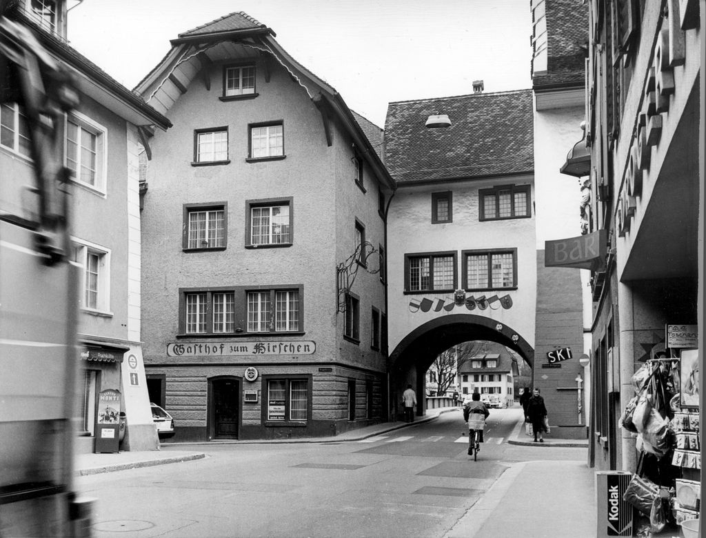 Papeterie (s. Firmentafel), Conditorei - Bäckerei von Tobel, Hotel Hirschen, Laden in der ehemaligen Zollstube, Brückentor