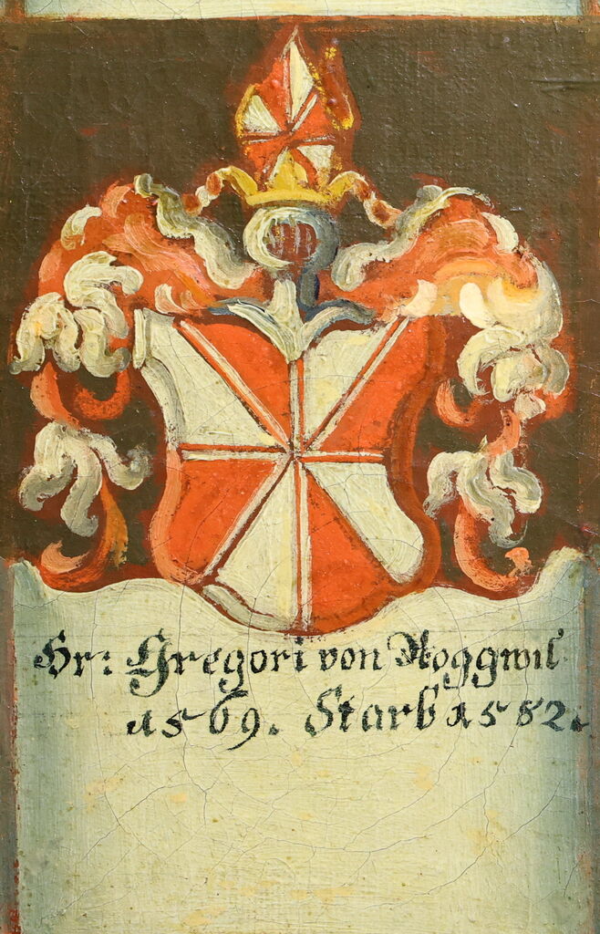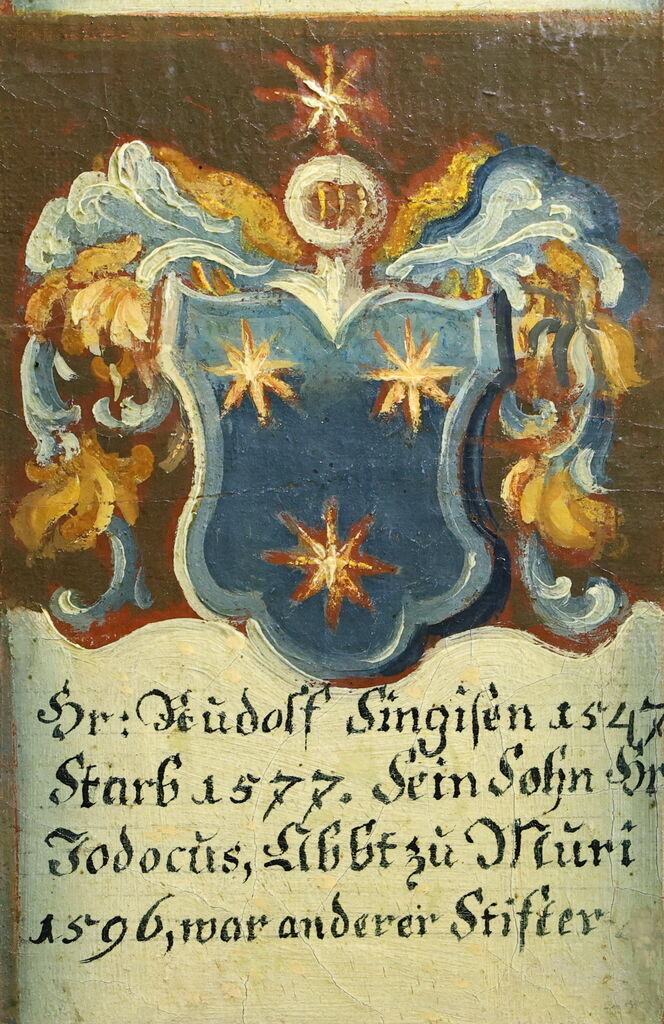 Dass Wappen mit steigendem Einhorn deutet auf jenes der Herren von Reussegg hin, welche im 14. Jahrhundert die Gerichtsherrschaft in Tägerig innehatten.