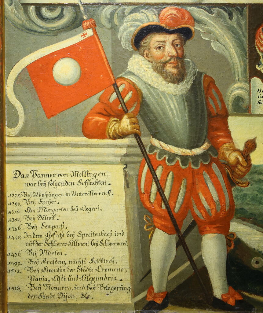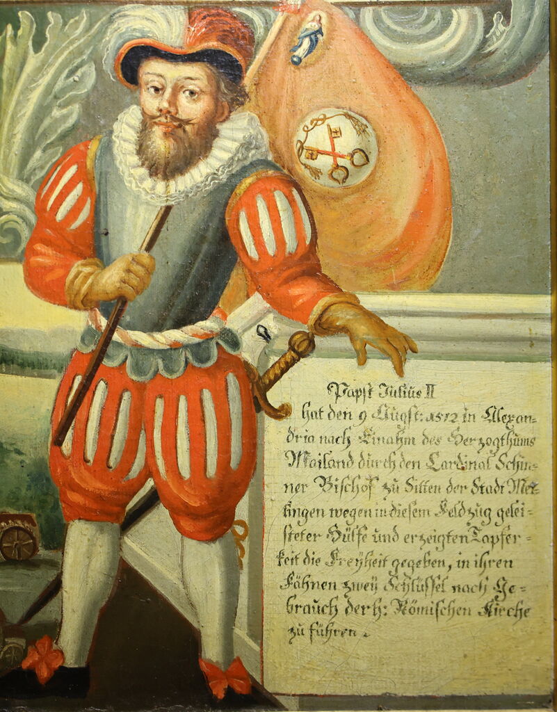 hat den 9. August 1512 in Alexandria nach Einnahm des Herzogthums Mailand durch den Cardinal Schinner Bischof zu Sitten der Stadt Mellingen wegen in diesem Feldzug geleisteter Hülfe und erzeigten Tapferkeit die Freyheit gegeben, in ihren Fähnen zwei Schlüssel nach Gebrauch der H: Römischen Kirche zu führen."