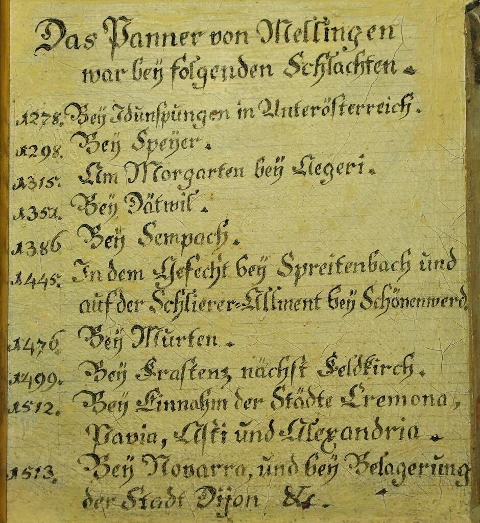Text: "Das Panner von Mellingen war bey folgenden Schlachten.