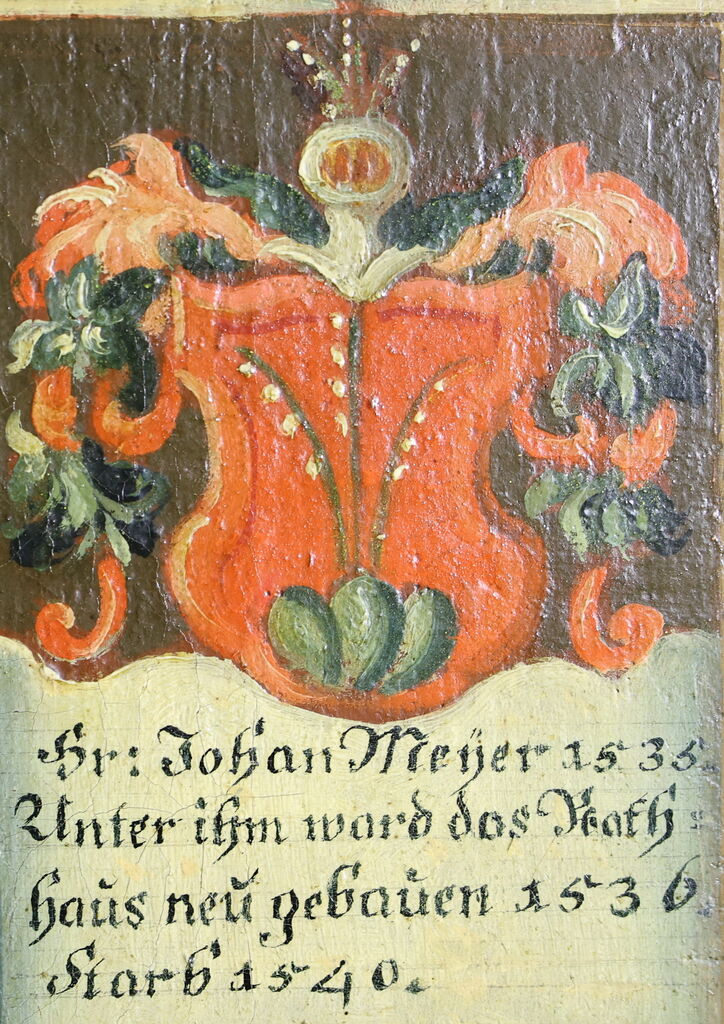 Text: "Hr: Johan Meyer 1535. Unter ihm ward das Rathhaus neu gebauen 1536. Starb 1540."