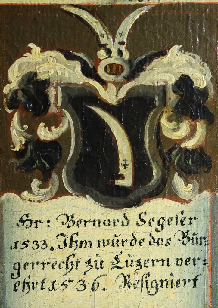 Text: " Hr: Bernard Segeser 1533. Jhm wurde das Burgerrecht zu Luzern verehrt 1536. Resigniert."