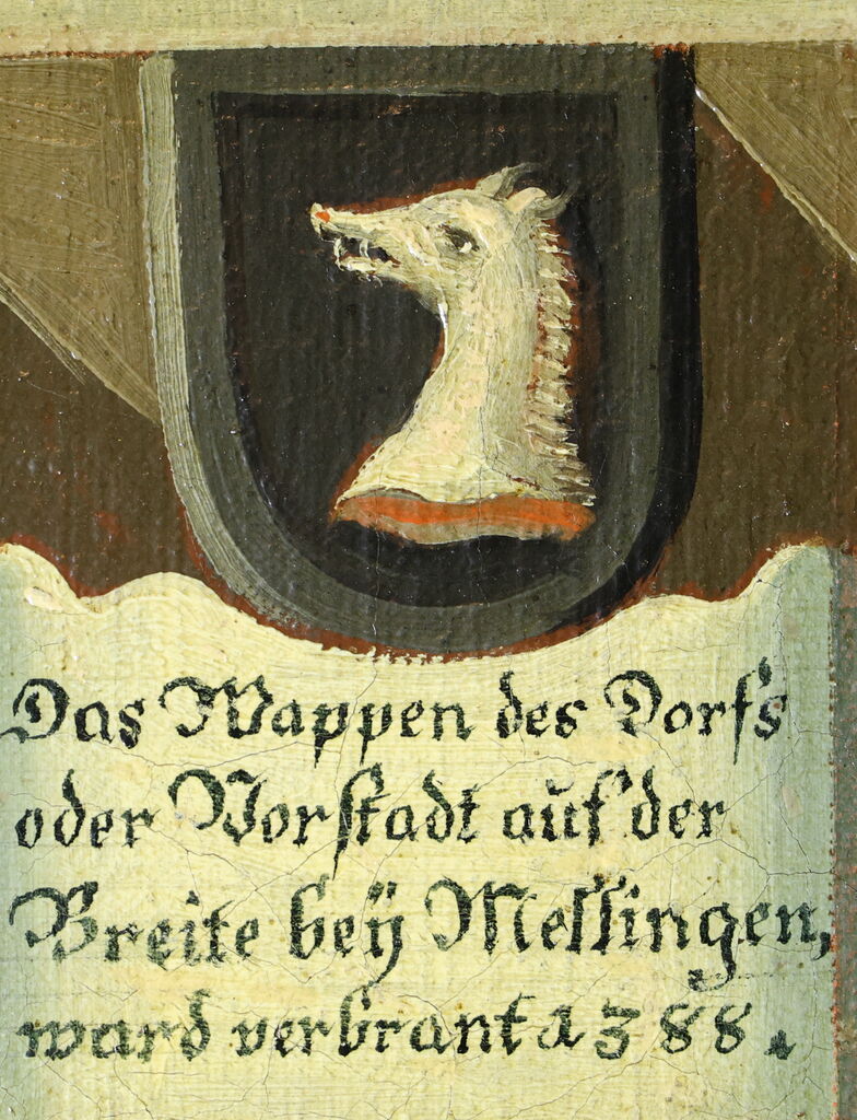 Text: "Das Wappen des Dorfs oder Vorstadt auf der Breite bey Mellingen, ward verbrant 1388."