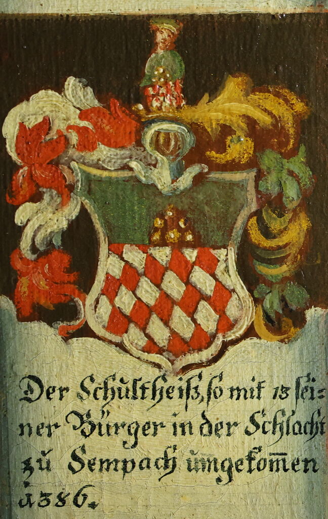 Text: "Der Schultheiss so mit 13 seiner Bürger in der Schlacht zu Sempach umgekommen ist."