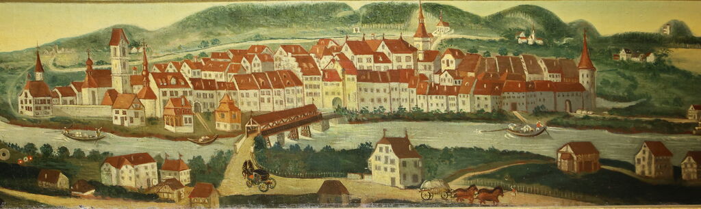 In der Mitte die Altstadt. Unten links Bruggmühle und das Schützenhaus, unten in der Mitte das Schlösschen Hünegg, unten rechts die Widenmühle.