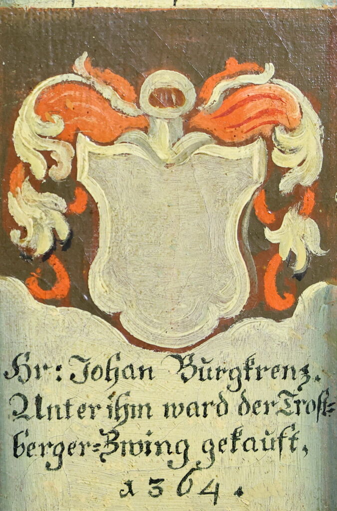 Text: "Hr: Johan Burgkrenz. Unter ihm ward der Trostberger=Zwing gekauft, 1364."