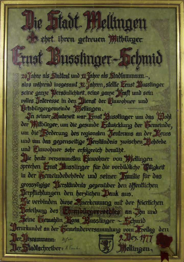 Ernst Busslinger und seine Gattin Rosa erhalten 1977 das Ehrenbürgerrecht der Gemeinde Mellingen.