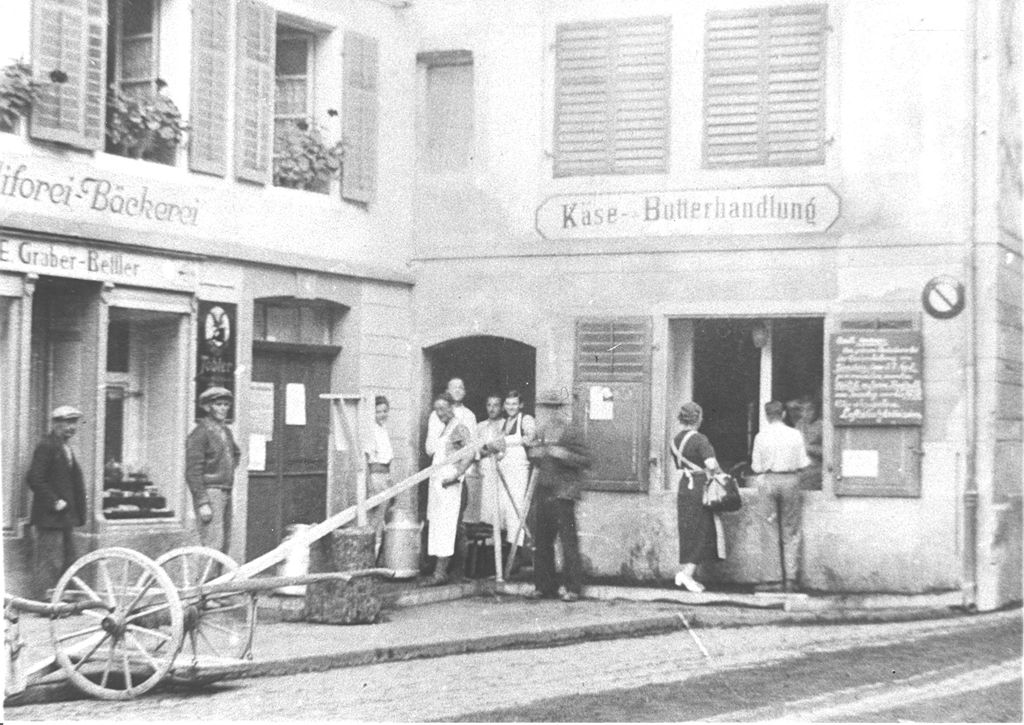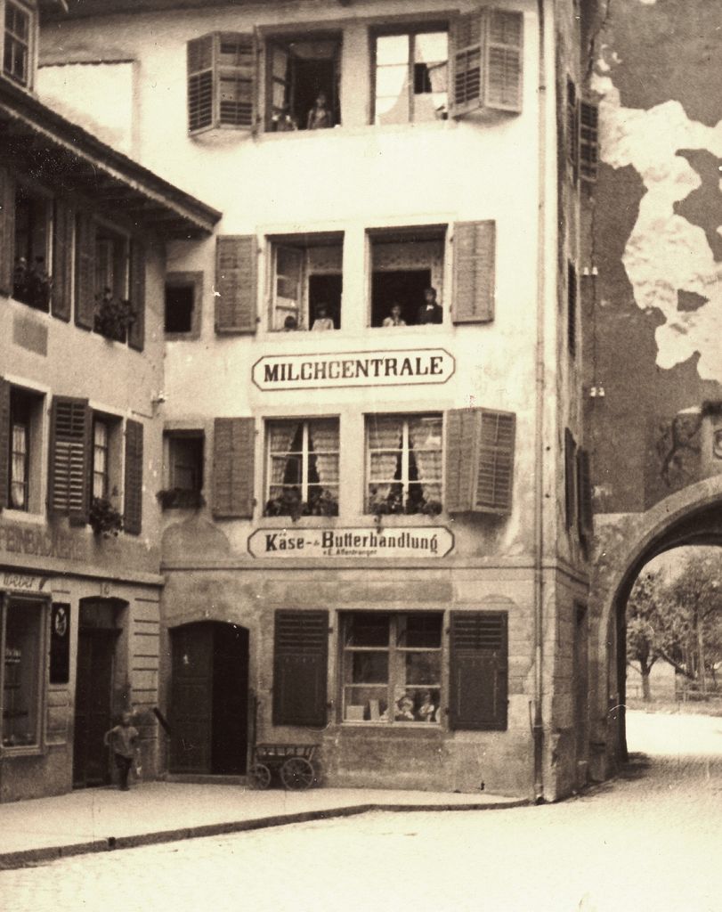 Das Bild mit den Aufschriften „Conditorei Erwin Graber-Bettler“ (Hauptgasse 15) und „Käserei – Butterhandlung“ (Hauptgasse 17) entstand nach 1938. Es zeigt einen Blick von der Städtchen-Innenseite her. An der Stelle, wo die Bauern die Milch in die Milchzentrale (Hauptgasse 17) anlieferten und die Kunden vom Laden her bedient wurden, führt seit 1953 neben dem historischen Durchgang unter dem Zeitturm eine zweite Fahrbahn und eine Fussgängerpassage durch.