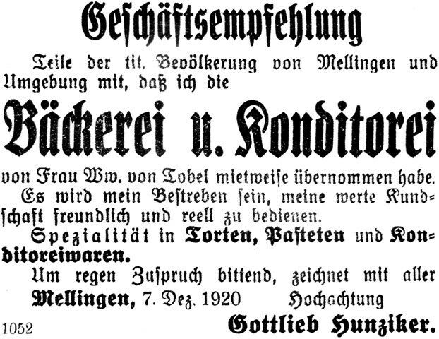 Im Dezember 1920 übernahm Gottlieb Hunziker von Frau Ww. von Tobel mietweise die Bäckerei und Konditorei.