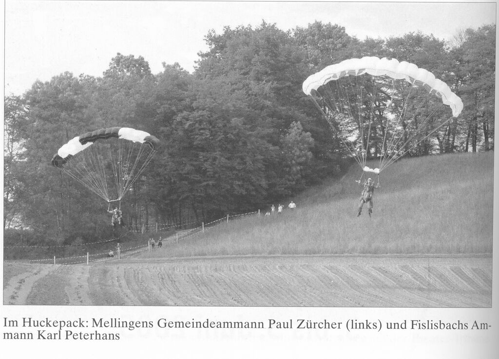 Als dann eine gute halbe Stunde später Karl Peterhans, Gemeindeammann von Fislisbach, und der Mellinger Stadtamman Paul Zürcher, fest verbunden im Huckepack mit ihren Fallschirmspringern aus über 2000 Metern Höhe kommend vor der Station gelandet waren und die Fahnen übergeben hatten, verteilte sich die Festgemeinde auf das ganze Festareal, wo Beizen und Bars bereit standen, um hungrige Mägen und durstige Kehlen zu ihrem Recht kommen zu lassen. Wer Karten hatte, genoss die erste Festspiel-Aufführung der Mellinger Spiellüüt oder Iiess sich vor der Festbühne unterhalten, wo sich die Musikgesellschaft und der Turnverein von Stetten ein Stelldichein gaben und später von den Notenquälern von Mellingen abgelöst wurden.
