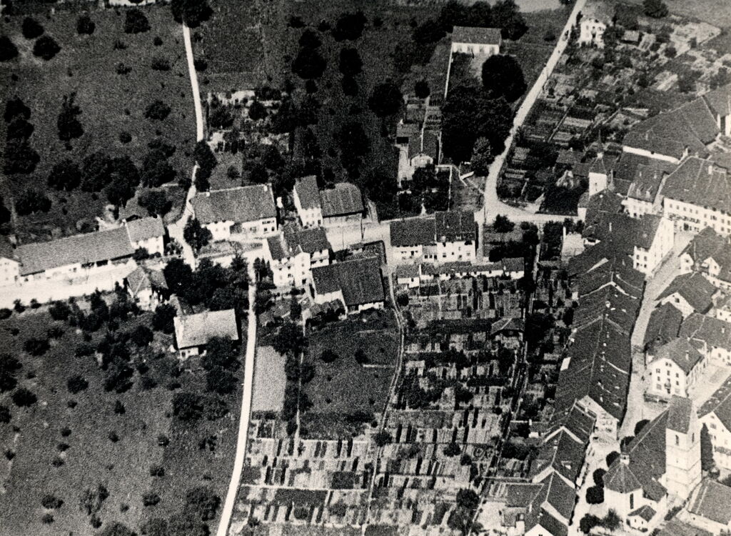 Blick auf die Städtligärten. Foto von circa 1940, wo auch noch die Gärten zwischen dem Büblikerweg und der nördlich des Zeitturms liegenden Häuserzeile sichtbar sind. Anstelle des Büblikerwegs wurde 1958 die Birrfeldstrasse angelegt.
