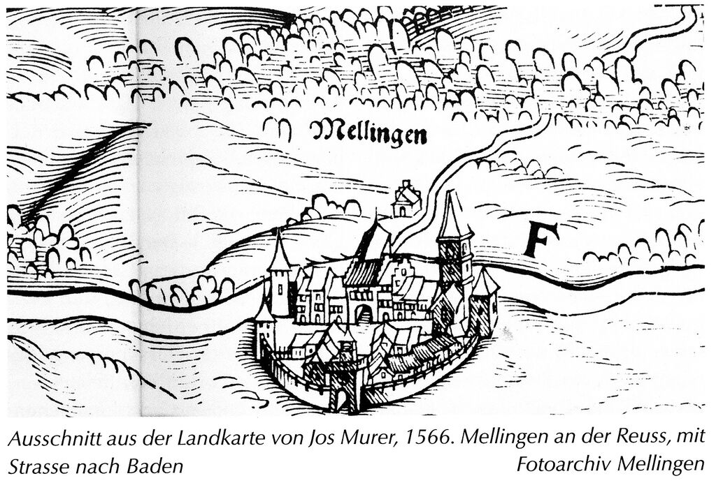 ln der Zeit der Religionskriege spielte aber noch ein anderer Faktor eine entscheidende Rolle. lnsbesondere in Krisenzeiten führte die Strasse bis Bremgarten über eine wesentlich längere Strecke über das katholische Freiamt, während Mellingen nicht sehr weit von der Berner Grenze entfernt war. Dass die Strecke über Mellingen bevorzugt wurde, lässt sich auch mit Zahlen beIegen. Sowohl in Mellingen als auch in Bremgarten mussten die Fuhrleute neben dem Zoll zusätzlich das sogenannte Geleitsgeld, eine hochobrigkeitliche Abgabe, entrichten. Das Geleitsgeld war eine mittelalterliche Abgabe der Kaufleute für gewährten Schutz, das bis ins 18. Jahrhundert an die Landesherren, in unserem Fall an die acht regierenden Orte, bezahlt werden musste. Da das Einziehen dieser kleinen Summen mit der Zeit kompliziert wurde, verliehen die Orte das Geleit für einen bestimmten Betrag an den sogenannten Geleitsmann, der dann die effektiven Gelder selbst einsacken konnte. lm 17. Jahrhundert betrug die jährliche Leihsumme in Bremgarten 90 Gulden, in Mellingen 200 Gulden. lm 18. Jahrhundert wurde diese Einnahmequelle sogar versteigert. Das Geleit von Mellingen war dabei besonders begehrt und brachte den regierenden Orten bis 455 Gulden ein. Mit 100 Gulden war die Steigerungssumme in Bremgarten recht bescheiden. Für Fussgänger und Reiter war aber der Umweg über Baden nach Zürich recht gross. Diese benutzten darum den Heitersbergpass, eine damals schlecht ausgebaute Strasse. Diese führte von Mellingen nach Rohrdorf bis hinauf zum Weiler Heitersberg (Gemeinde Spreitenbach) auf 657 Metern Höhe und von dort nach Spreitenbach oder Dietikon. Diese noch heute bestehende Verbindung war auch bei kriegerischen Ereignissen ein bedeutender Übergang.