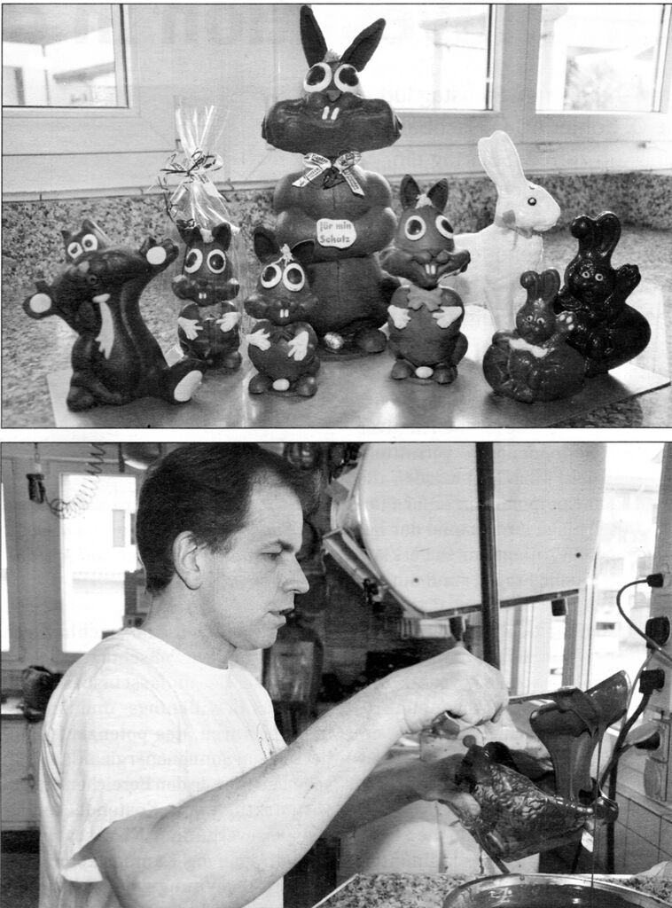 Trotzdem: Für ihn ist Ostern immer noch einer der wichtigsten Anlässe im Jahresverlauf und das Vorbereiten der feinen Schoggihasen bereitet ihm und seinem kleinen Team von erfahrenen Mitarbeiterinnen persönlich eine be sondere Freude. Weil die Herstellung der Osterhasen eine delikate Angelegenheit ist, braucht es dafür eine gute Planung. Denn die Kakaomasse ist geschmacksempfindlich und nimmt rasch Fremdgerüche auf. Schoggihasen werden deshalb meist am späten Morgen oder gar Nachmittag produziert, wenn es kein Mehl von Brot, Gipfeli etc. mehr auf den Produktionstischen hat.