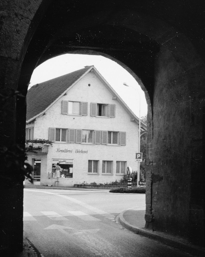 Blick durchs Lenzburgertor auf die Bäckerei Graber --> 1947 - 1972 an der Birrfeldstrasse 1.