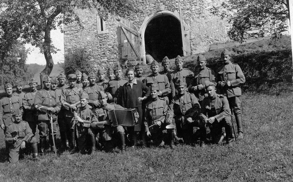 Da die Trotte 1930 abgebrochen wurde, stammt das Bild aus der Zeit davor, vielleicht gar aus dem Ersten Weltkrieg. Offenbar benutzte man das leerstehende Gebäude nicht nur als Turnhalle sondern auch als Truppenunterkunft.