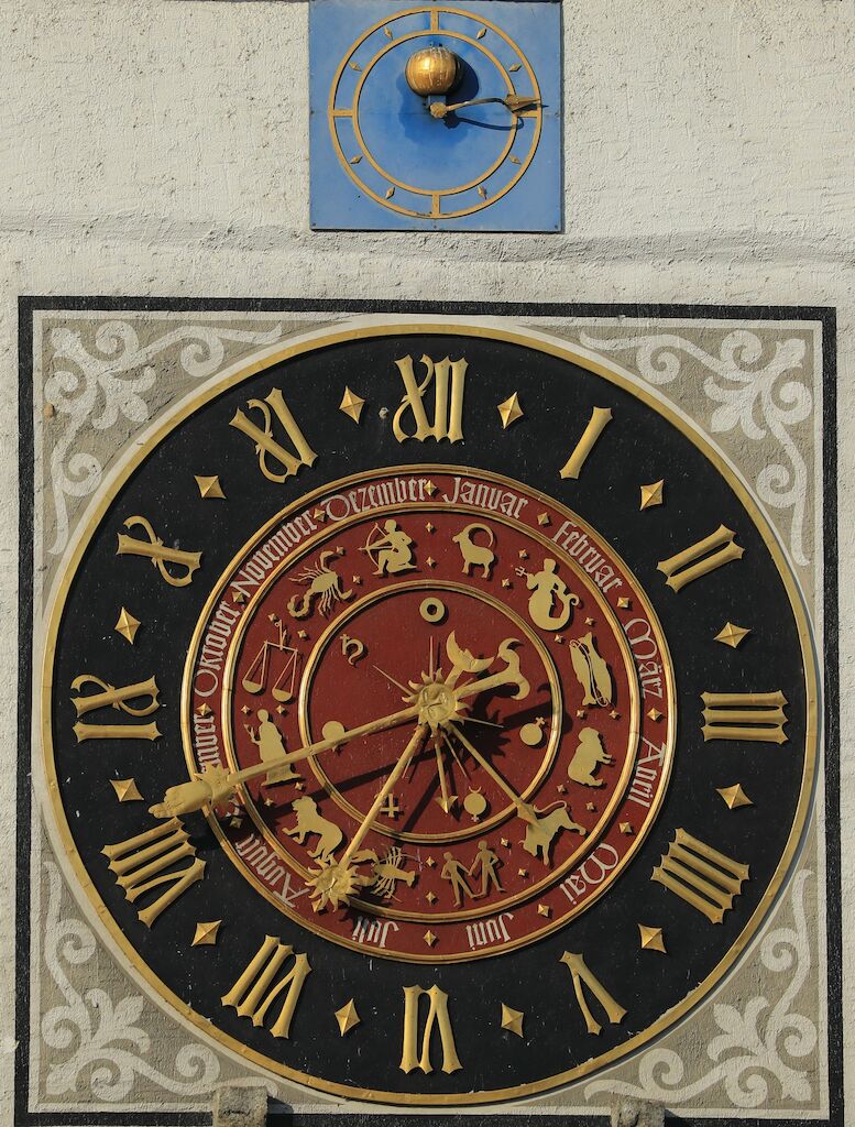 Die astronomische Uhr aus dem Jahre 1544 bildet die stolze Zier des Zeitturms.