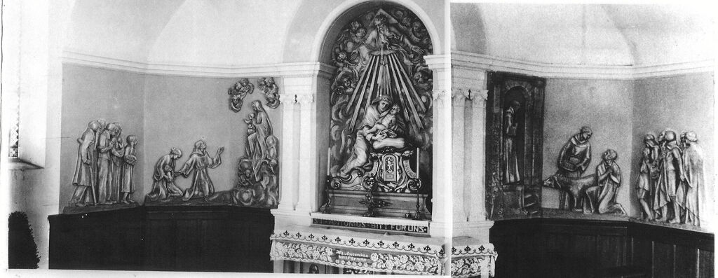 20 000 Fr. zusammen, so dass 1923 die Erneuerung der Kapelle, ohne dass dadurch die Kirchgemeinde finanziell stark belastet worden wäre, an die Hand genommen werden konnte. Die Antoniusstatue der Mellinger Künstler Franz Xaver und Kaspar Josef Widerkehr kehrte nach rund 60jährigem Exil vom Altersheim wieder an ihren angestammten Platz auf den Altar des Kirchleins zurück. Noch heute trauern manche Gläubige den links und rechts des Altars auf Betreiben von Richard Bopp angebrachten Hochreliefs mit Szenen aus dem Leben des hl. Antonius nach. Diese von Alois Peyer und Franz Wipplinger geschaffenen Werke wurden anlässlich der letzten Restauration 1983 wieder entfernt. Jede Woche las der Pfarrer die Heilige Messe in «seiner» Kapelle, und die Antoniusnovenen, die Jeweils im Juni in der Kapelle stattfanden, gehörten gleich wie die Fastenandachten vor Ostern, die Maiandachten zu Ehren der Muttergottes, die Pfingstnovenen und die Rosenkranzandachten im Oktober zum festen Bestandteil des kirchlichen Lebens von katholisch Mellingen.