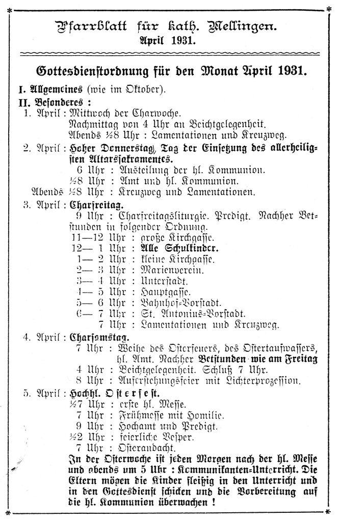Pfarrer Bopp führte regelmässig Volksmissionen durch, so 1927 von Palmsonntag bis Ostern. Geleitet wurden diese von Franziskanerpatres.