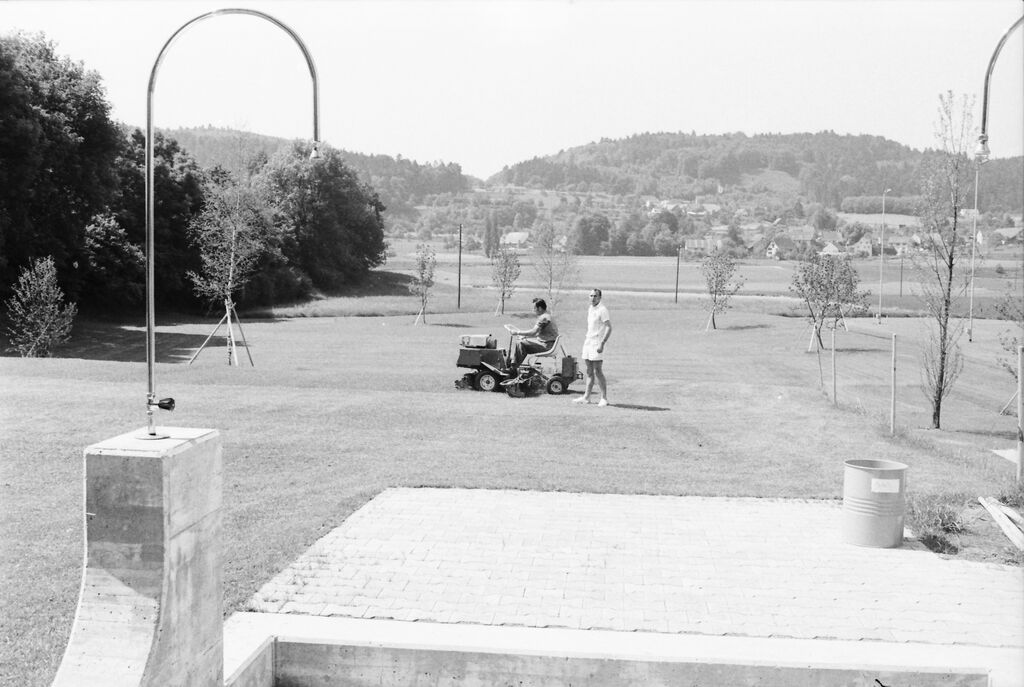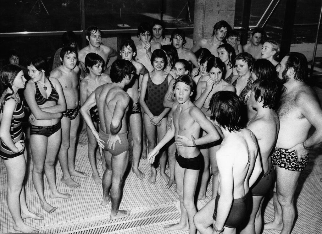 In Anwesenheit von Behörden, Baufachpersonen und Baukommission probieren die Schüler und Schülerinnen der Oberstufe das Hallenbad aus.