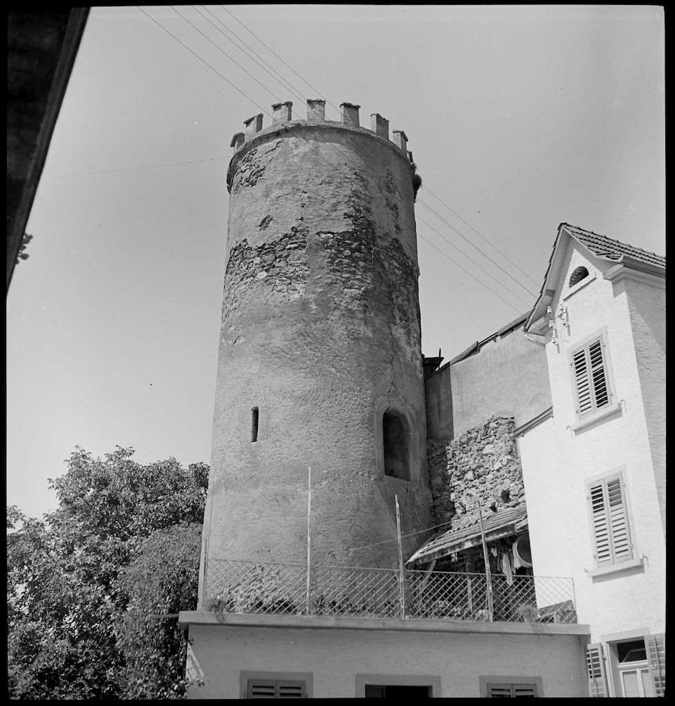 Links der Hexenturm mit Zinnenkranz. 1951 wurde der Turm wieder mit einem Spitzkegeldach versehen. Rechts davon das Gebäude Bruggerstrasse 11, dessen Aussenansicht sich seither recht stark verändert hat. Das Bild könnte aber auch recht viele Jahre vor 1951 aufgenommen worden sein.